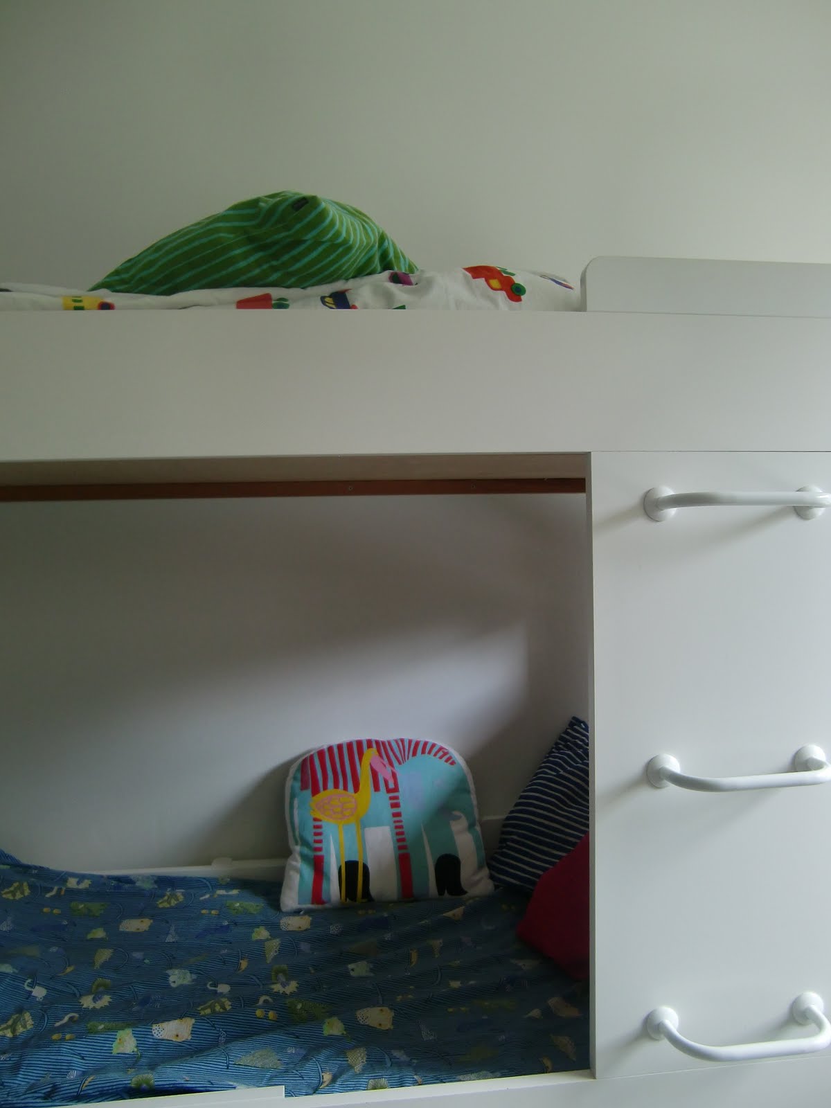 Nyt on tilanne kuitenkin se, että pojat halusivat malttamattomina nukkumaan uuteen kerrosänkyynsä, esikoinen kokee pääsyn yläsänkyyn jotenkin seikkailuna. En ihan heti raaskisi heitä sieltä olla häätämässä. Näin sateisella ja painostavalla ilmalla maalinhajukaan ei meinaa millään häipyä...